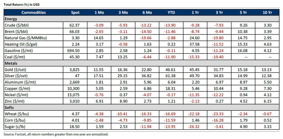 The Dow Jones Commodity Index, which aggregates several different commodities into one measure, returned 2.36% during the third quarter (source: S&P Global). However, that belies what was another exceptional period for precious metals. Gold and silver were quietly rangebound during much of July and August, but once they got going in September they did not stop, rallying 16.8% and 29.2%,respectively, over the three months. That impressive stretch extended gold's year-to-date return to47.0% and silver's to 61.5%. Other commodities did not experience such strong returns, though. West Texas Intermediate crude oil fell slightly from around $65 to $62 during the quarter, while natural gas similarly dropped 4.6%. A larger loss befell copper, which typically moves in response to global growth expectations. It collapsed from almost $6 to $4.30 in late July, before settling at $4.83 to end September. While there continues to be a debate surrounding the U.S. dollar's long-term position as the global reserve currency, especially in light of huge moves in gold and silver, the U.S. Dollar Index, which measures the dollar against a basket of foreign currencies, strengthened slightly during the quarter.