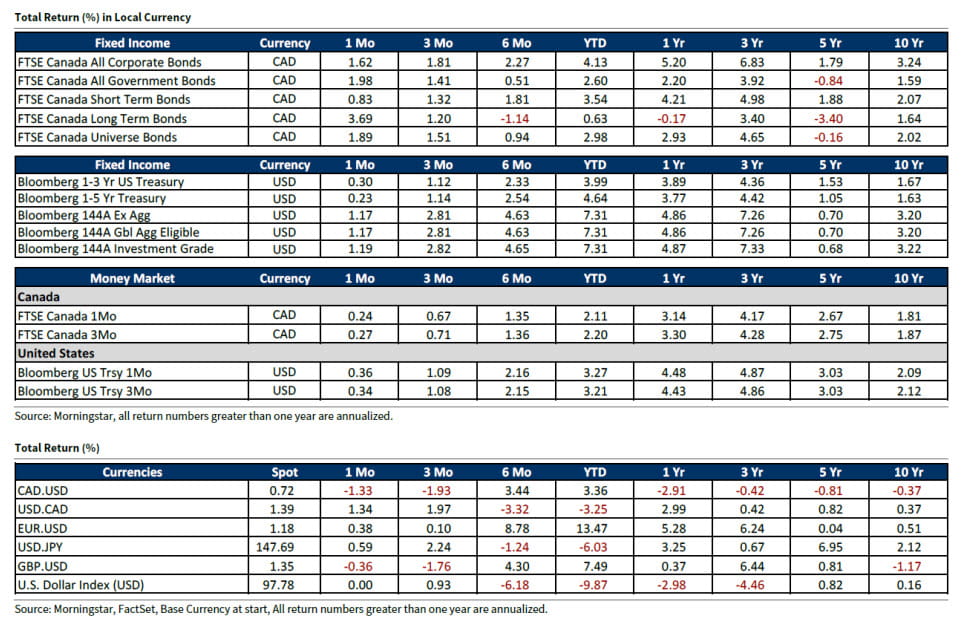 Consumer spending in Canada remains resilient, supported by household savings and wealth effects from strong equity market performance. However, rising unemployment could dampen future consumption. The housing market continues to show strength in terms of sales, although prices remain down year-to-date. Rental markets are soft, impacted by elevated inventories and slowing immigration. Inflation remains contained, with headline CPI rising to 1.9% in August— still below the Bank of Canada’s 2% target — and core inflation measures holding steady. Looking ahead, the federal budget is scheduled for November 4 and is expected to include increased infrastructure and industrial investment. The deficit is projected to widen to $68.5 billion for the 2025–26 fiscal year.